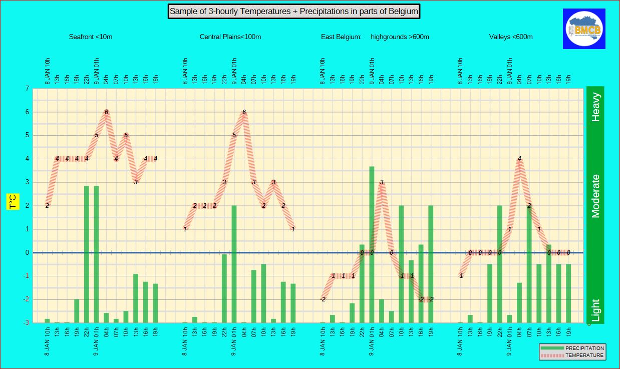 Minimumtemperaturen (bereikt in de avond): 4°C aan zee, 1 tot 3°C in het binnenland, 0 tot +1°C ten zuiden van de Samber-Maaslijn.
