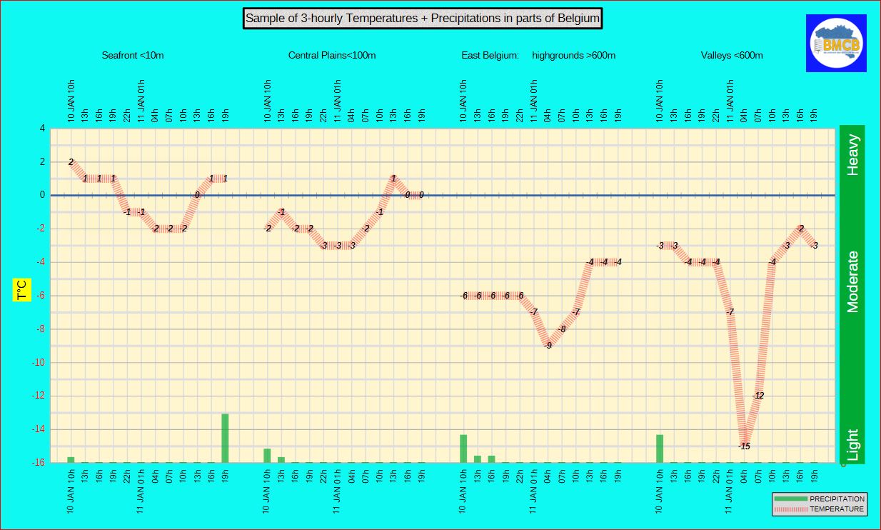 Températures minimales : -2°C à la côte, -2 à -5°C dans l'intérieur, -4 à -9°C au sud du sillon Sambre-et-Meuse, et -10 à -15°C dans les vallées, où le gel sera sévère.