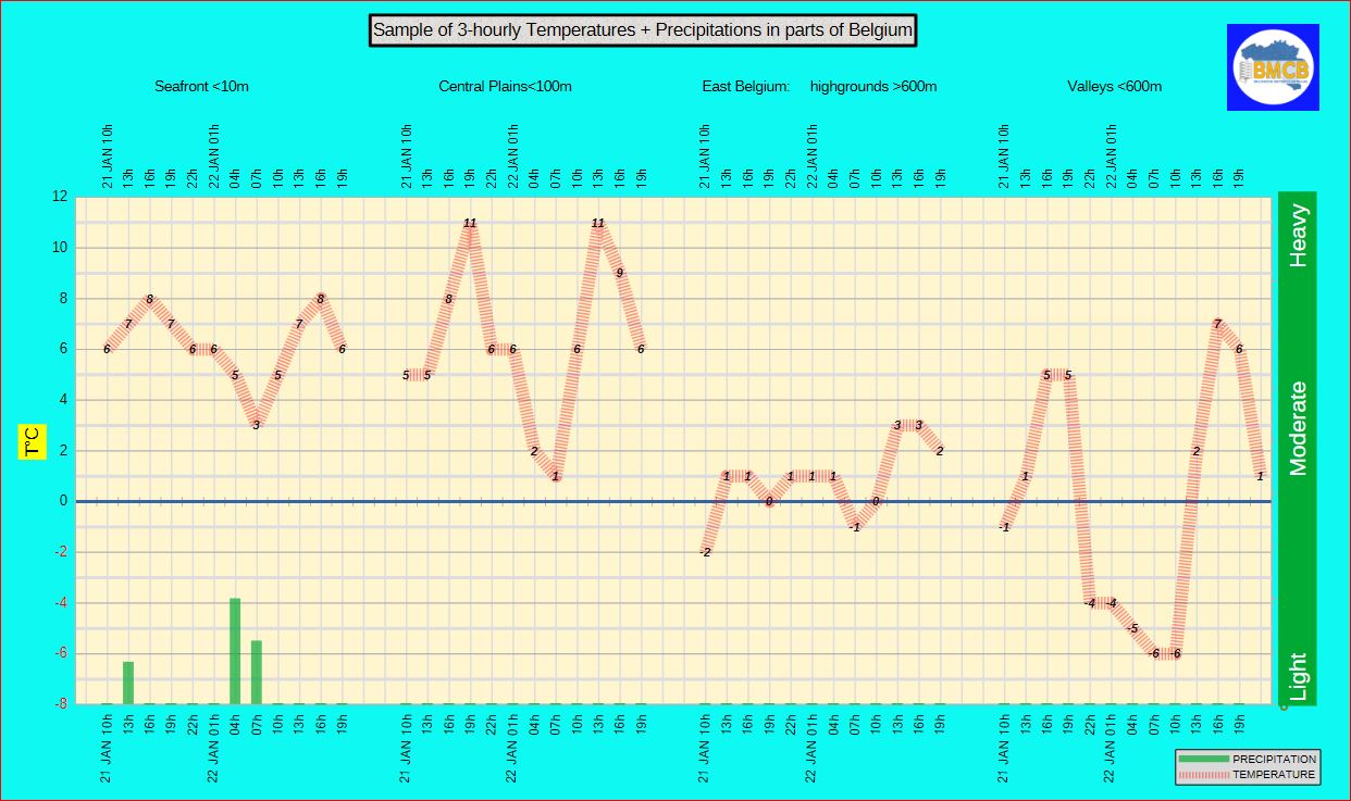 Tiefstwerte: rund 3°C an der Küste, 1 bis 5°C im Binnenland, –1 bis –4°C südlich der Sambre–Maas, in den Tälern bis –6°C.