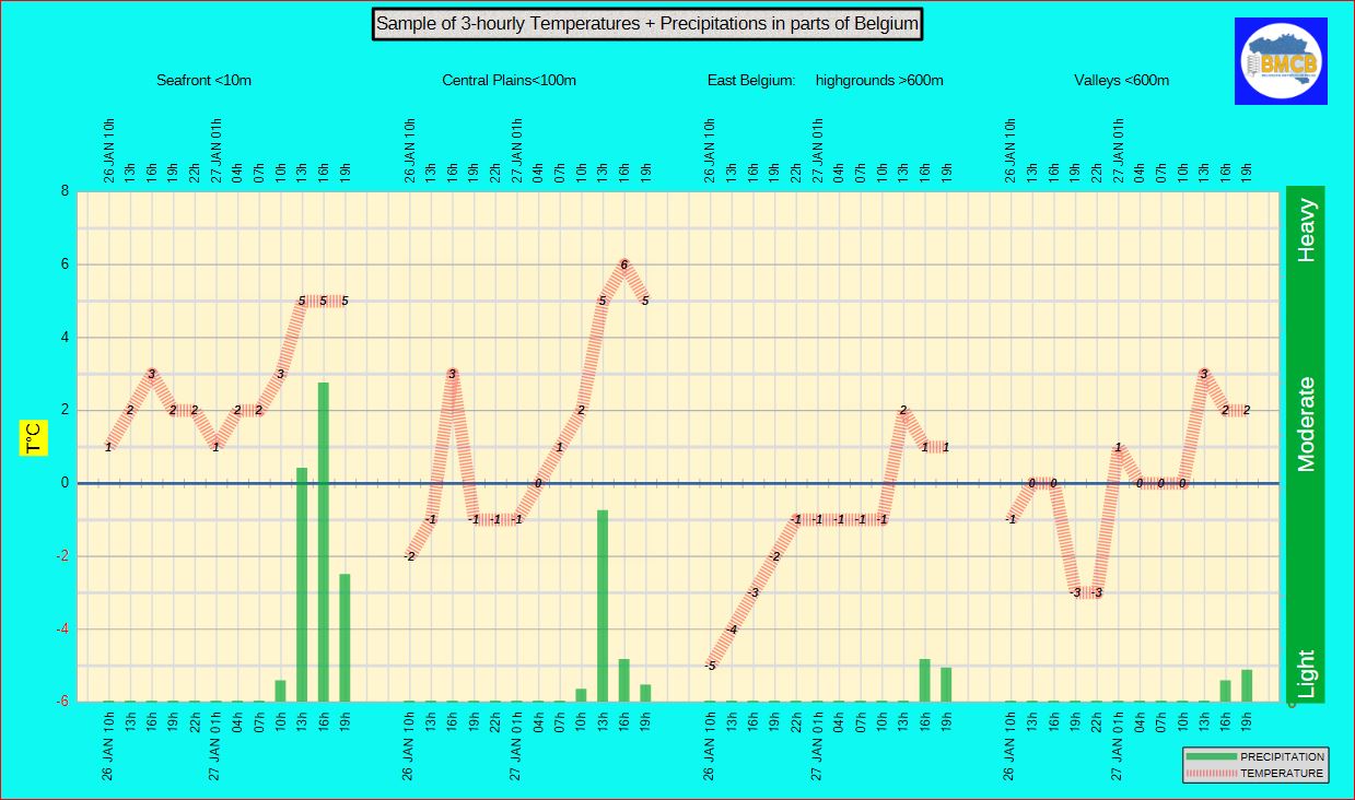 Am Nachmittag wird es verbreitet regnerisch. Die Höchstwerte erreichen rund 5°C an der Küste, 4 bis 7°C im Binnenland, bleiben jedoch in den Hochlagen der Ardennen bei 2 bis 3°C.