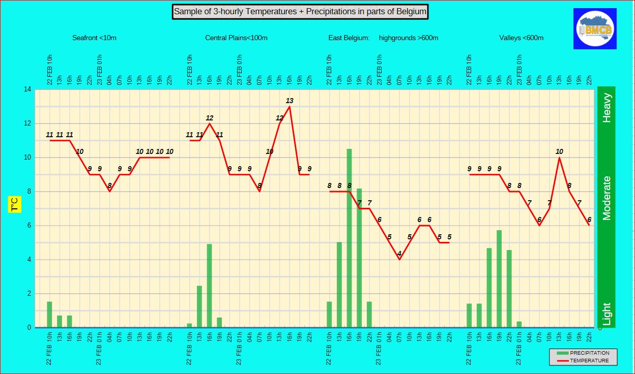 Höchstwerte um 10°C an der Küste, 11 bis 13°C im Landesinneren und 6 bis 10°C in den Hohen Ardennen.