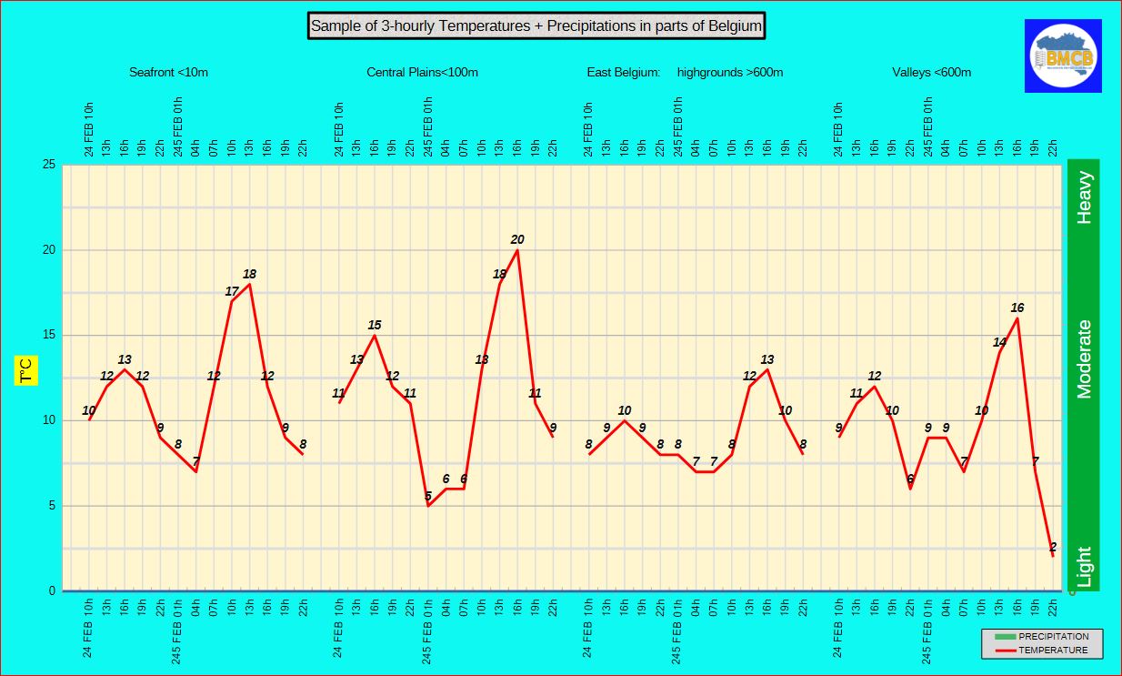 Die Höchsttemperaturen steigen weiter an und erreichen etwa 18 °C an der Küste, 17 bis 20 °C im Landesinneren und 13 bis 16 °C in den Ardennen.